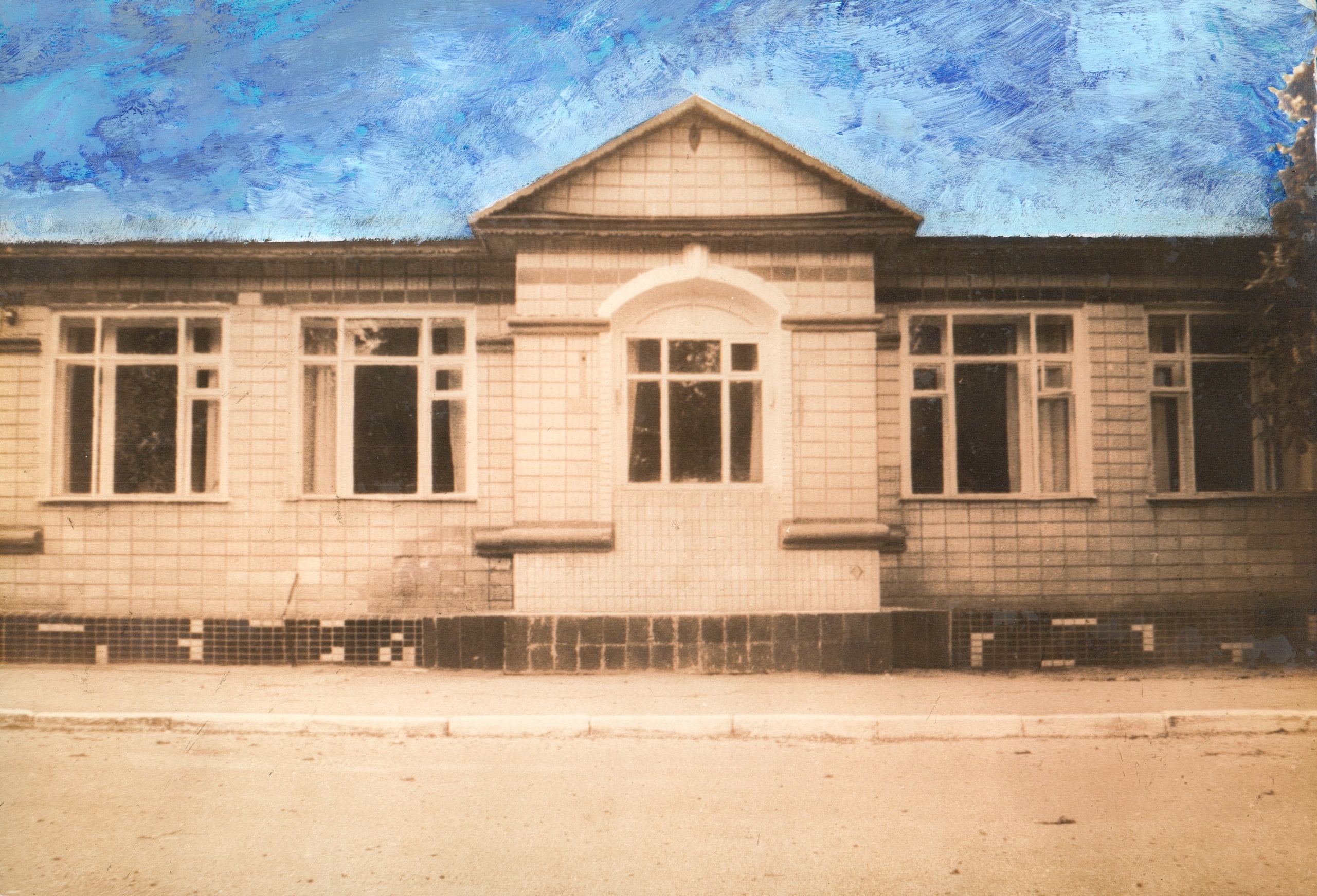 Нацпром: Олег Тістол, Микола Маценко. Фронтони Баришівки. 2003. Фотографія, додатково розфарбована олією. 20 × 30 см