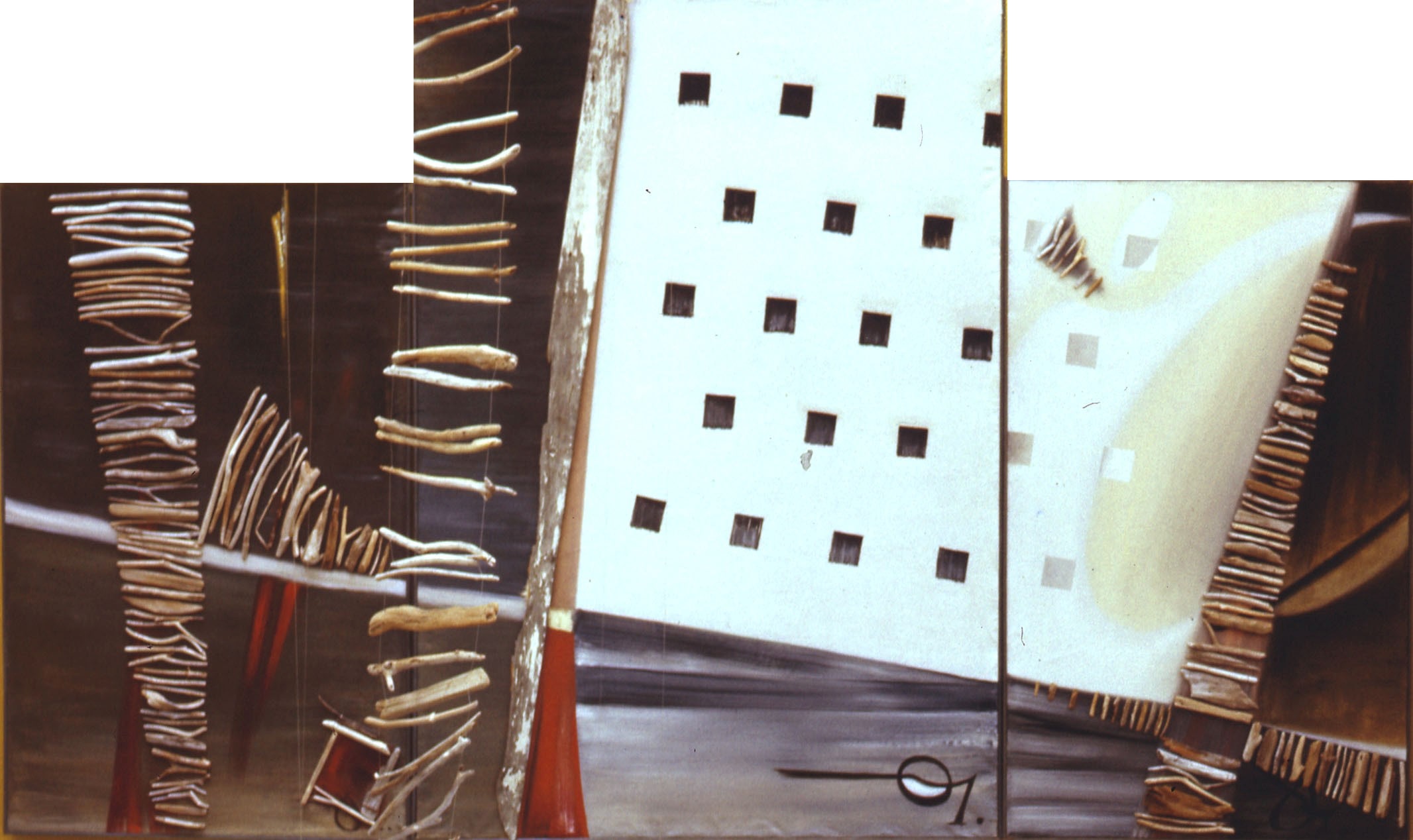 Оксана Чепелик, 1993, Триптих: Шляхами нашої пам’яті 1, або Ніч, Шляхами нашої пам’яті 2, Шляхами нашої пам’яті 3, або День, живопис, інсталяція, різні розміри (158 × 100 см, 203 × 100 см, 158 × 100 см відповідно)