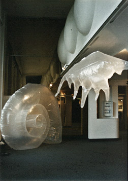 Для дефіле моделі були одягнені в ексцентричні сукні, створені за проектом художниці. До суконь чіплялися величезні, прозорі, створені з поліетилену, мушлі. На них проектувалися геометричні зображення, які, завдяки нерівній поверхні поліетилену, набували округлих м’яких форм, схожих на хвилі у воді чи іншій динамічній субстанції. Пізніше ці прозорі конструкції (3 великі та 11 маленьких) експонувалися у якості самостійних об’єктів. Їх і представляє дана робота.