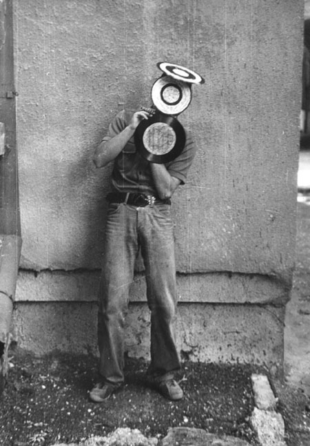 Юрій Лейдерман тримає в руках грампластинки, на яких в центрі намальовано Зірку Давида. В роті – сопілка. Грампластинки тут виступають і щитом (на обличчі) і шлемом (на голові).