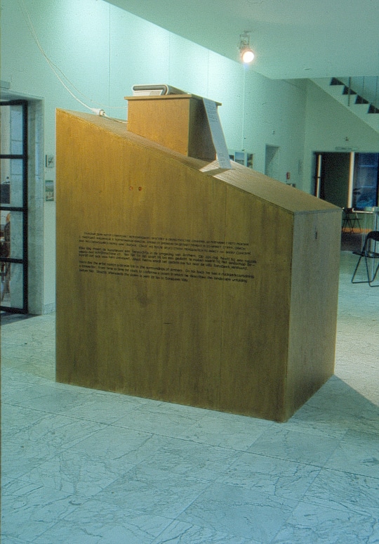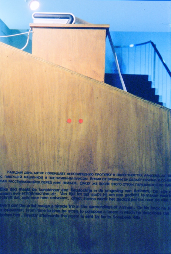Проект, осуществленный на этой выставке в 1993 году, состоял в следующем. На вилле был сооружен помост высотой примерно в человеческий рост, на котором был установлен факс-аппарат. В течение всей выставки каждый день автор совершал велосипедные прогулки в окрестностях Арнема. За плечами у него был рюкзак с пишущей машинкой и портативным факсом. Время от времени он делал привалы и сочинял стихи, описывая расстилающиеся перед ним окрестности, собственные аллюзии по их поводу или вообще все что прийдет в голову, затем стихи передавались по факсу на виллу Сонсбик. Таким образом, принимающий сообщения аппарат вдруг начинал работать, и из него выползала новая порция бумажной ленты со стихотворным текстом, которая вскоре проваливалась через щель внутрь помоста. В помосте также были проделаны два глазка, через которые зритель мог заглянуть внутрь. Ничего неожиданного он, впрочем, не видел – все та же бумажная лента стихотворного текста, свивающаяся в спирали и падающая на пол [1]
